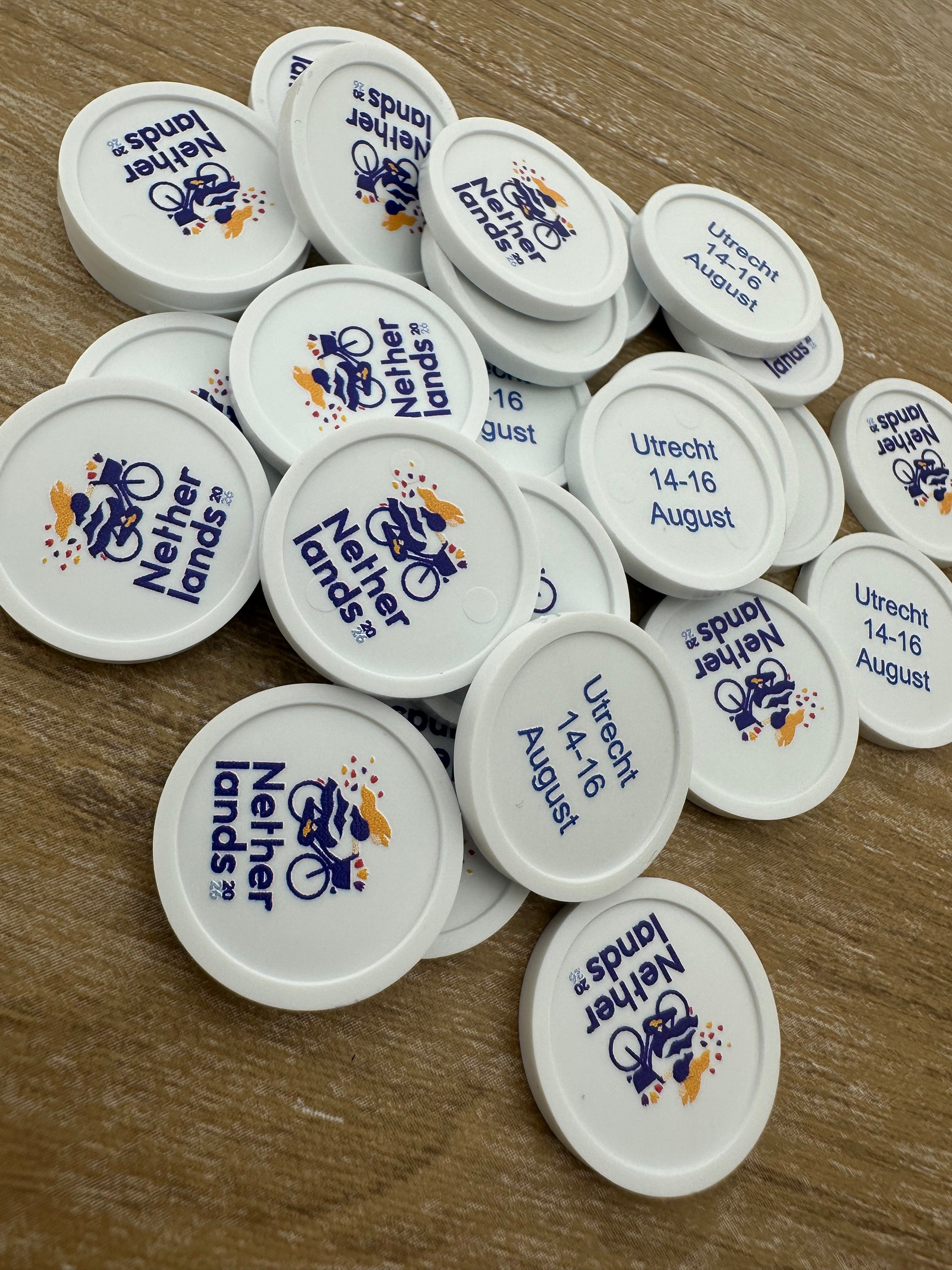 Personaliza tus propias fichas de plástico para carritos en formato de €1. Añade, por ejemplo, un texto, logotipo o ilustración en una o ambas caras. Son una herramienta práctica para liberar la cadena de un carrito de la compra. Se entregan en paquetes de 100 unidades.