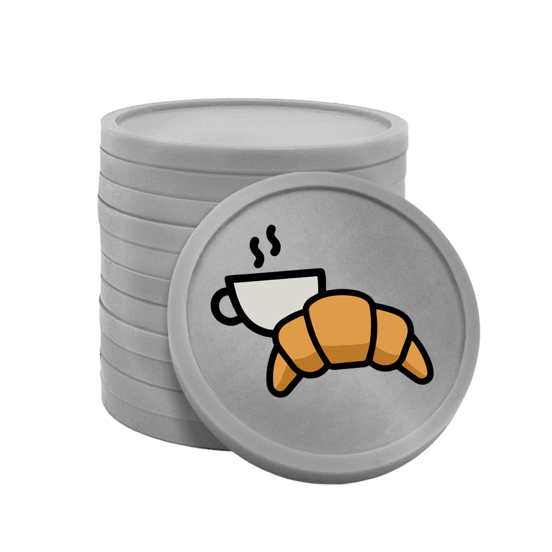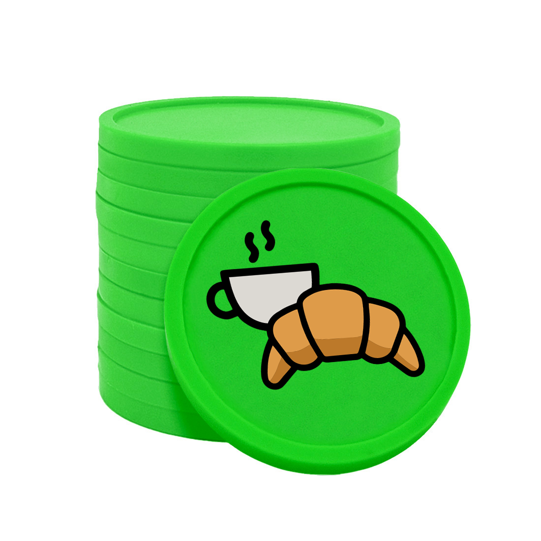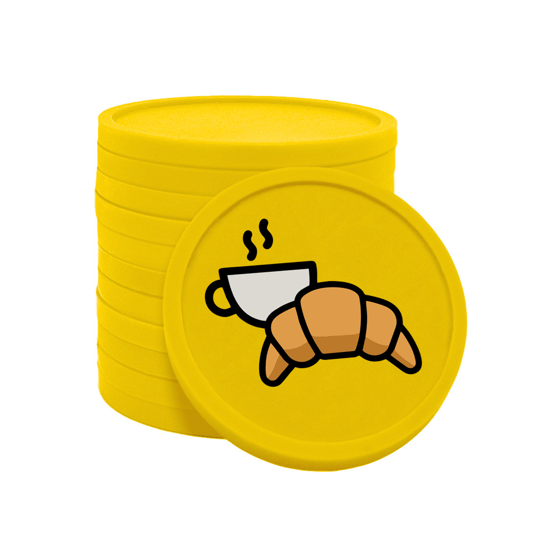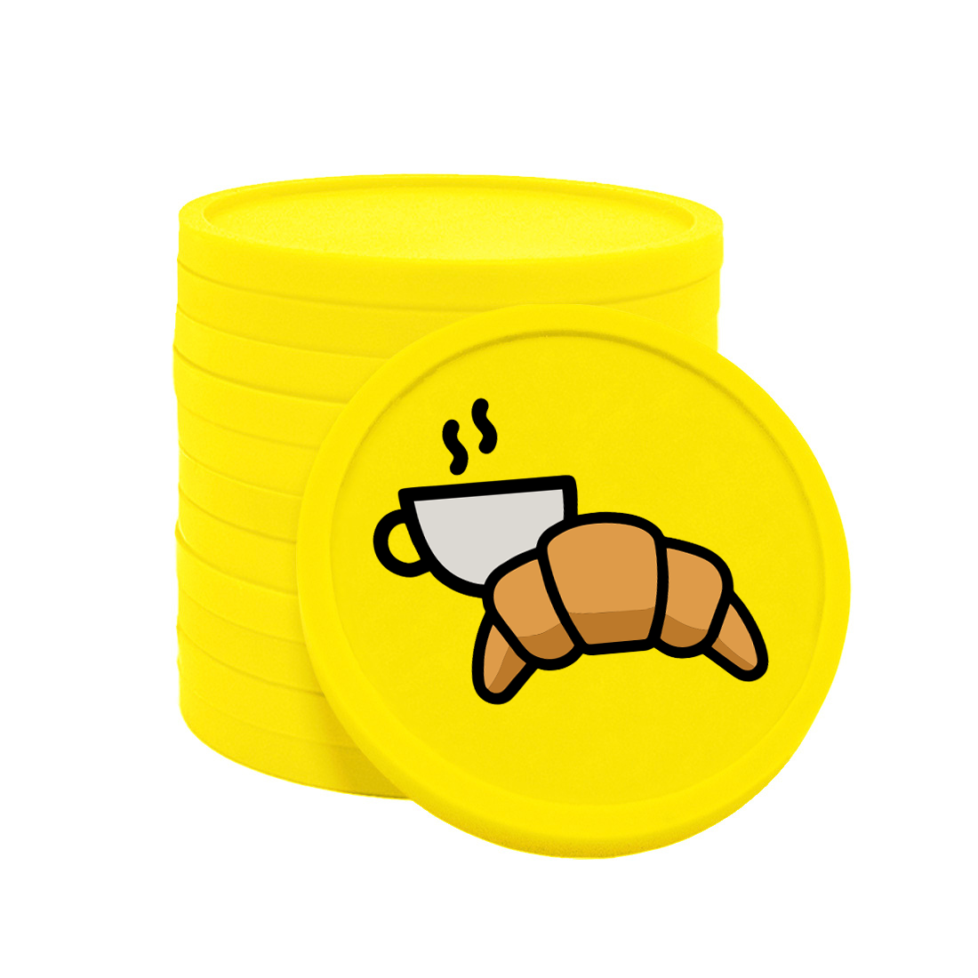 Fichas de plástico de 29 mm con impreso a color, que representan un croissant y café. Todas las fichas tienen un borde elevado y un grosor de 2,35 mm. estas fichas son muy prácticas a la hora de pagar en la barra de refrescos o en el puesto de comida. Se presentan en paquetes de 100 unidades.