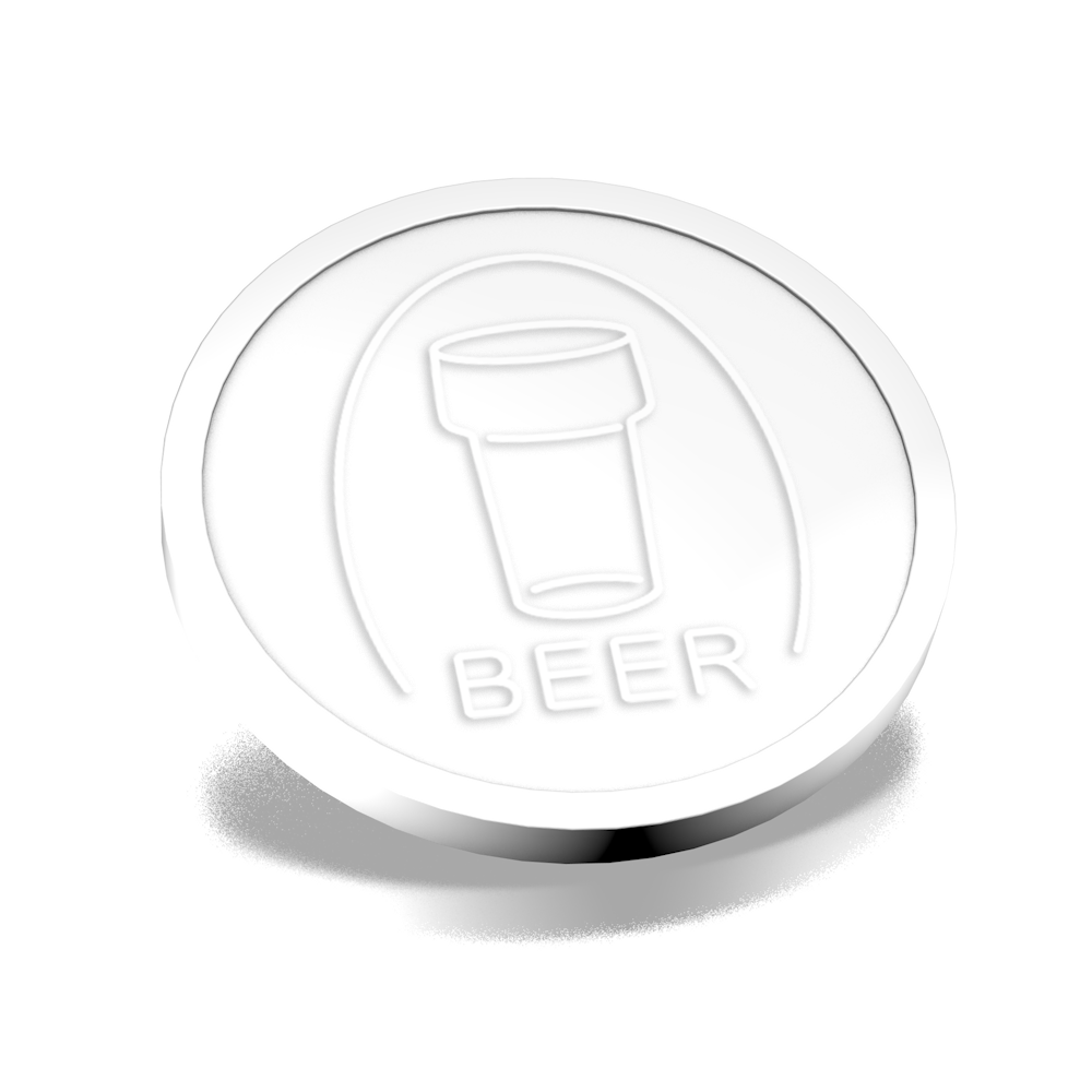 Las fichas en relieve están hechas de plástico y tienen un diámetro de 29 mm y un grosor de 2,35 mm. Presentan un borde elevado y un reconocible icono de un vaso de cerveza  en ambos lados con el texto "BEER" debajo. Gracias a su diseño universal, son aptas para uso internacional. Las fichas de cerveza en relieve están disponibles en varios colores llamativos.