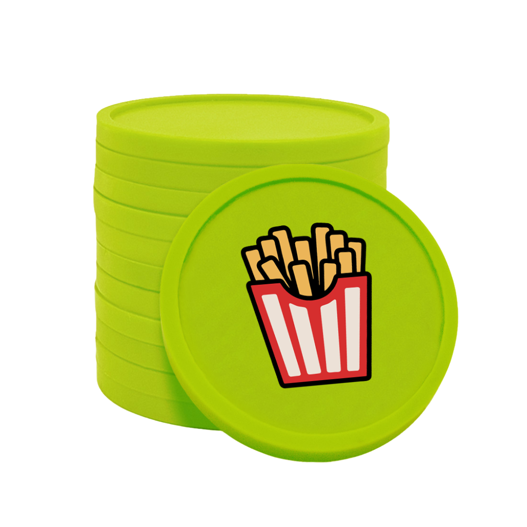 Fichas de 29 mm de diámetro con el icono de patatas fritas. Tienen un borde elevado y un grosor de 2,35 mm. Impresión a una o dos caras. Ideales como fichas para aperitivos o como método de pago. Se venden en paquetes de 100 unidades. Leer más...