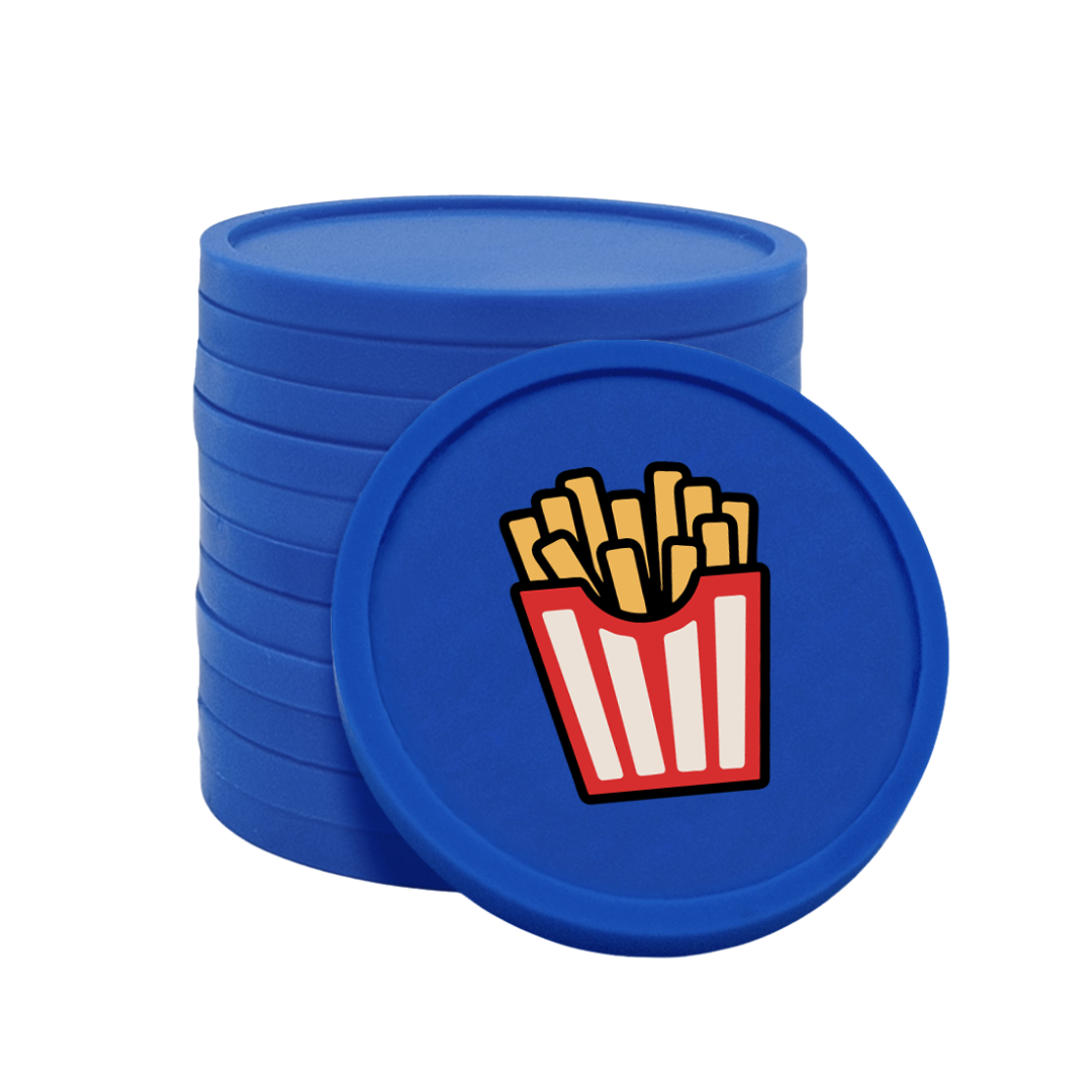 Fichas de 29 mm de diámetro con el icono de patatas fritas. Tienen un borde elevado y un grosor de 2,35 mm. Impresión a una o dos caras. Ideales como fichas para aperitivos o como método de pago. Se venden en paquetes de 100 unidades.
