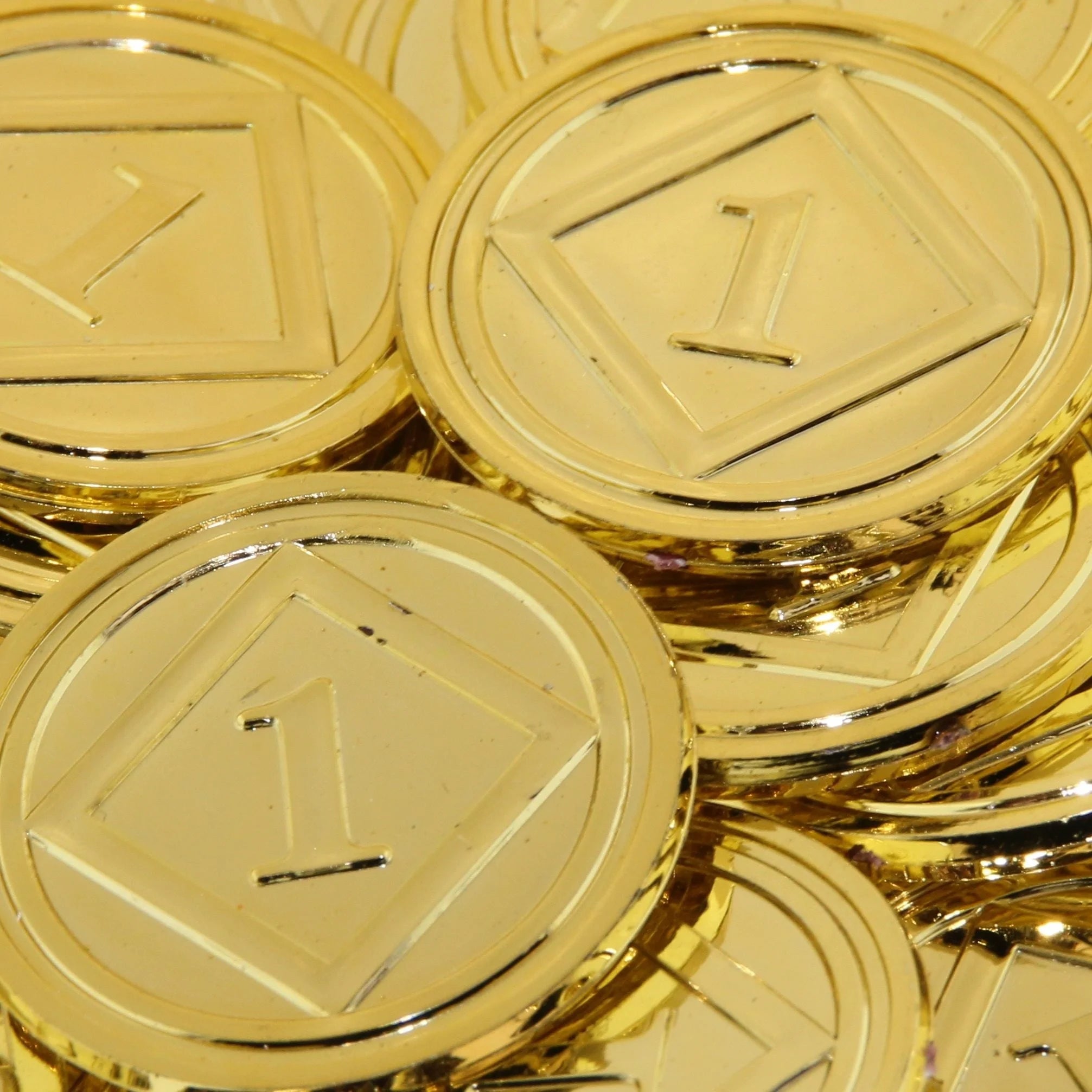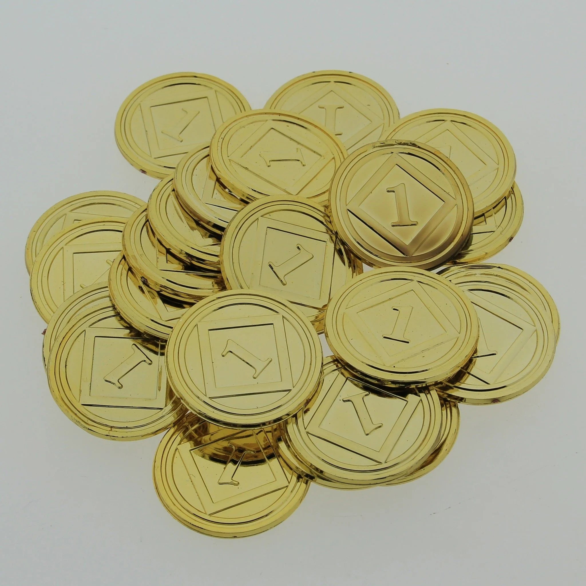 Fichas de plástico brillantes de 29 mm de diámetro en un elegante color dorado. Están anodizadas y, por lo tanto, son ligeramente más pesadas. Presentan el número 1 en relieve y tienen un grosor aproximado de 2,2 mm. Ideales como fichas para consumo, juegos o bebidas.