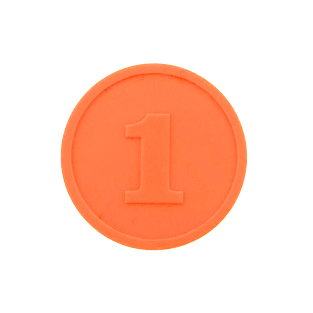 Las fichas en relieve son de plástico y tienen un diámetro de 29 mm y un grosor aproximado de 2,35 mm. Cada ficha tiene un borde elevado. Lucen el número 1 en relieve en ambas caras.