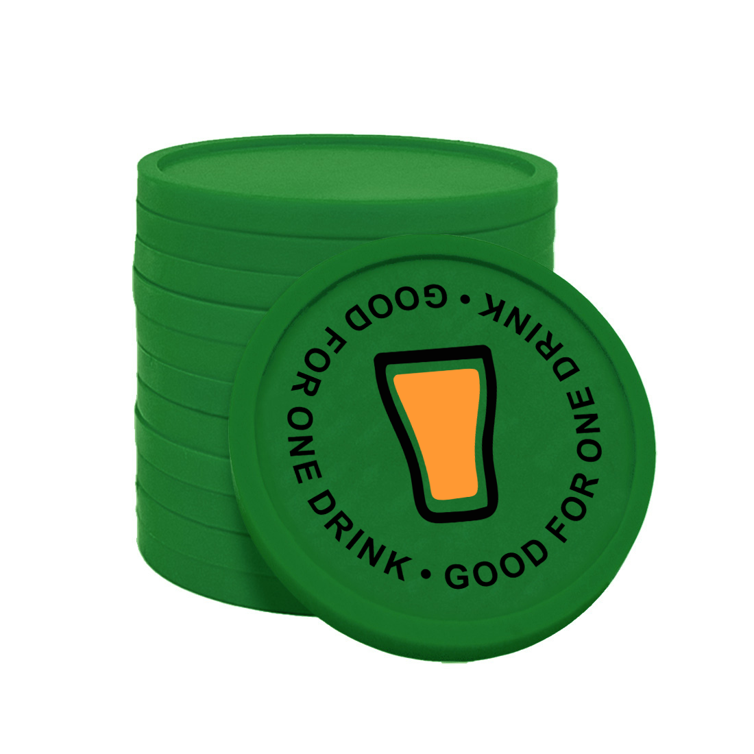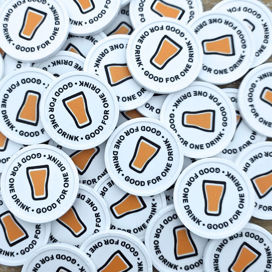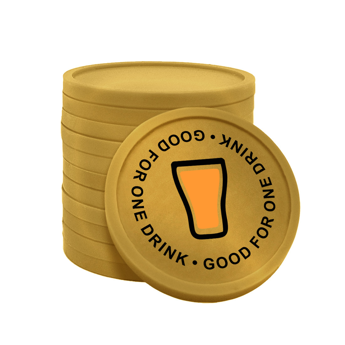 Fichas de 29 mm de diámetro con el texto "Good for one drink" para todo tipo de eventos. Las fichas tienen un borde elevado y un grosor aproximado de 2,35 mm. Impresión a una o dos caras. Ideales como fichas para bebidas. Se venden en paquetes de 100 unidades.