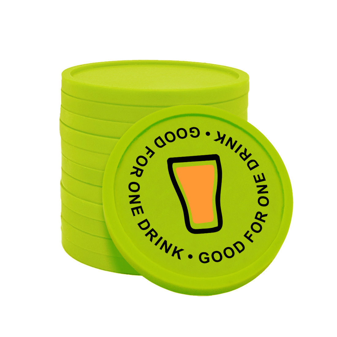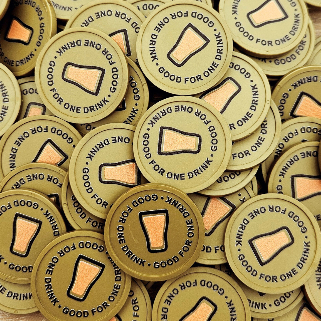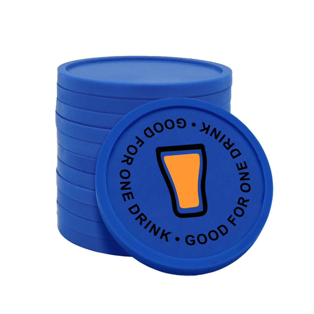 Fichas de 29 mm de diámetro con el texto "Good for one drink" para todo tipo de eventos. Las fichas tienen un borde elevado y un grosor aproximado de 2,35 mm. Impresión a una o dos caras. Ideales como fichas para bebidas. Se venden en paquetes de 100 unidades.