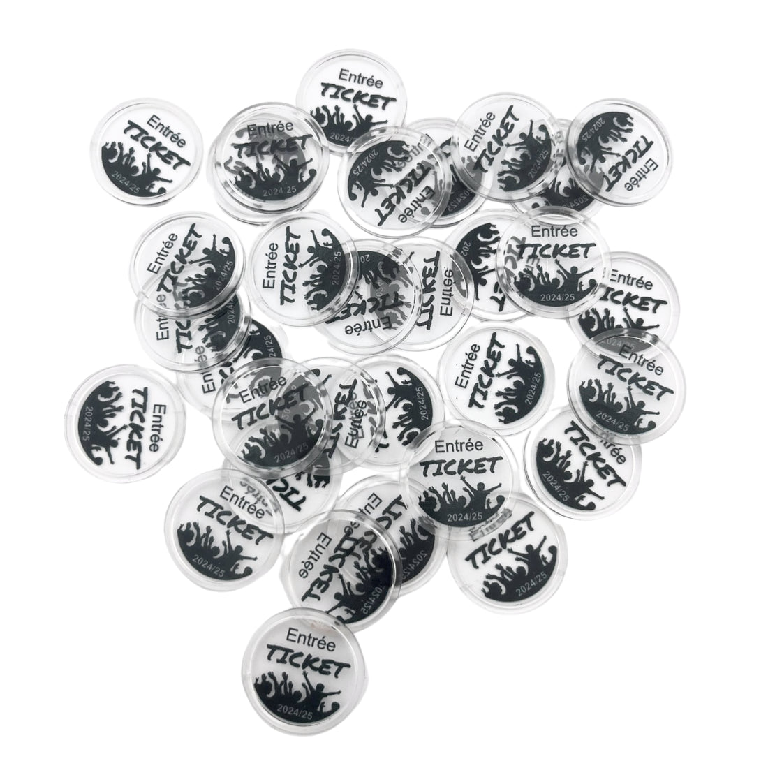 Diseña tus propias fichas transparentes de Ø25 mm para fiestas, eventos y festivales. Personalízalas con tu logotipo o texto, por ejemplo. Son ideales como fichas, métodos de pago o fichas de juego. Pídelas en paquetes de 100 unidades. Leer más...