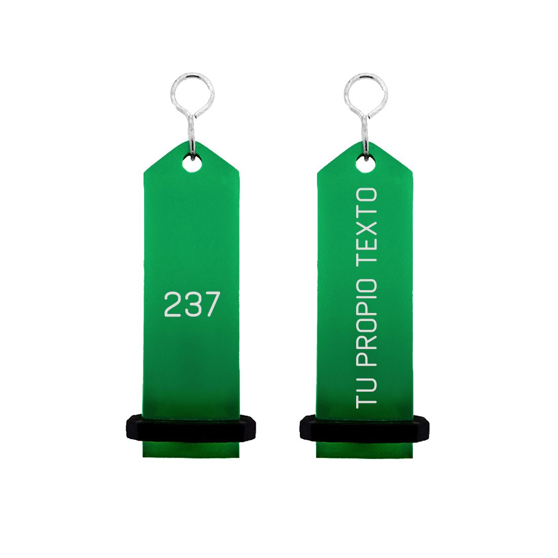 Descubre el versátil llavero de hotel Bumerang en color verde con grabado en blanco Personalízalo con texto, números o tu logotipo para un diseño único que refleje la identidad de tu servicio. Fabricado en aluminio macizo, con unas dimensiones de 30x100 mm.