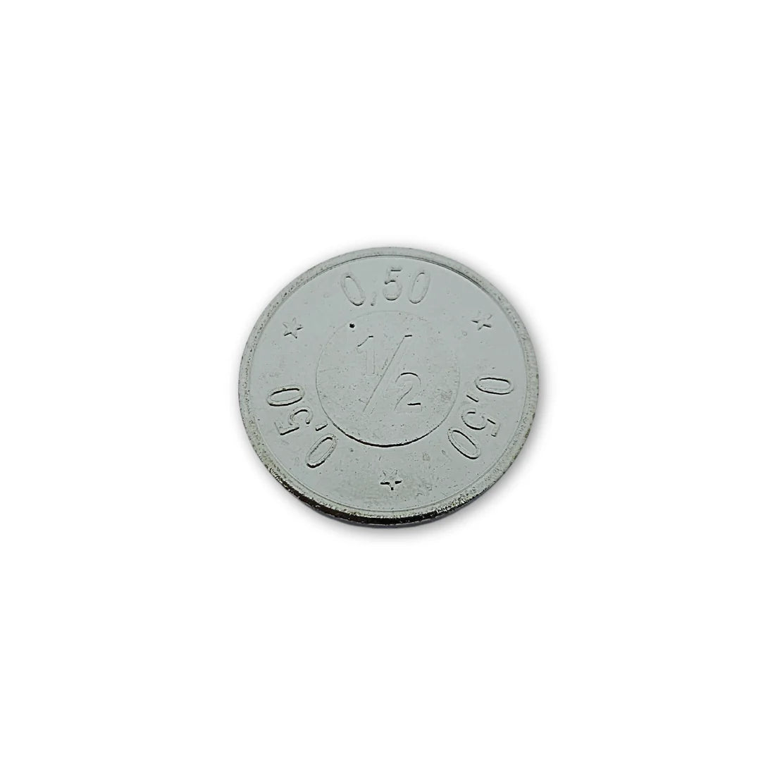 Moneda de acero niquelado con los números ½ , 0,50 y tres corazones. Las monedas tienen un diámetro de 24 mm y un grosor aproximado de 2.3 mm. Ideales como monedas para consumo, bebidas, pagos o juegos. Se presentan en paquetes de 100 unidades. Leer más...
