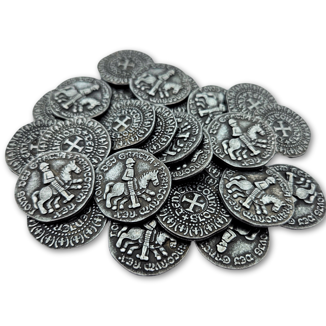 Monedas medievales plateada de bronce fundido, de aproximadamente 24 mm de diámetro. Cada moneda presenta un relieve diferente en ambas caras. Ideales para festivales, obras de teatro y eventos históricos. También son aptas como fichas de juego. Paquete de 100 monedas. Leer más...